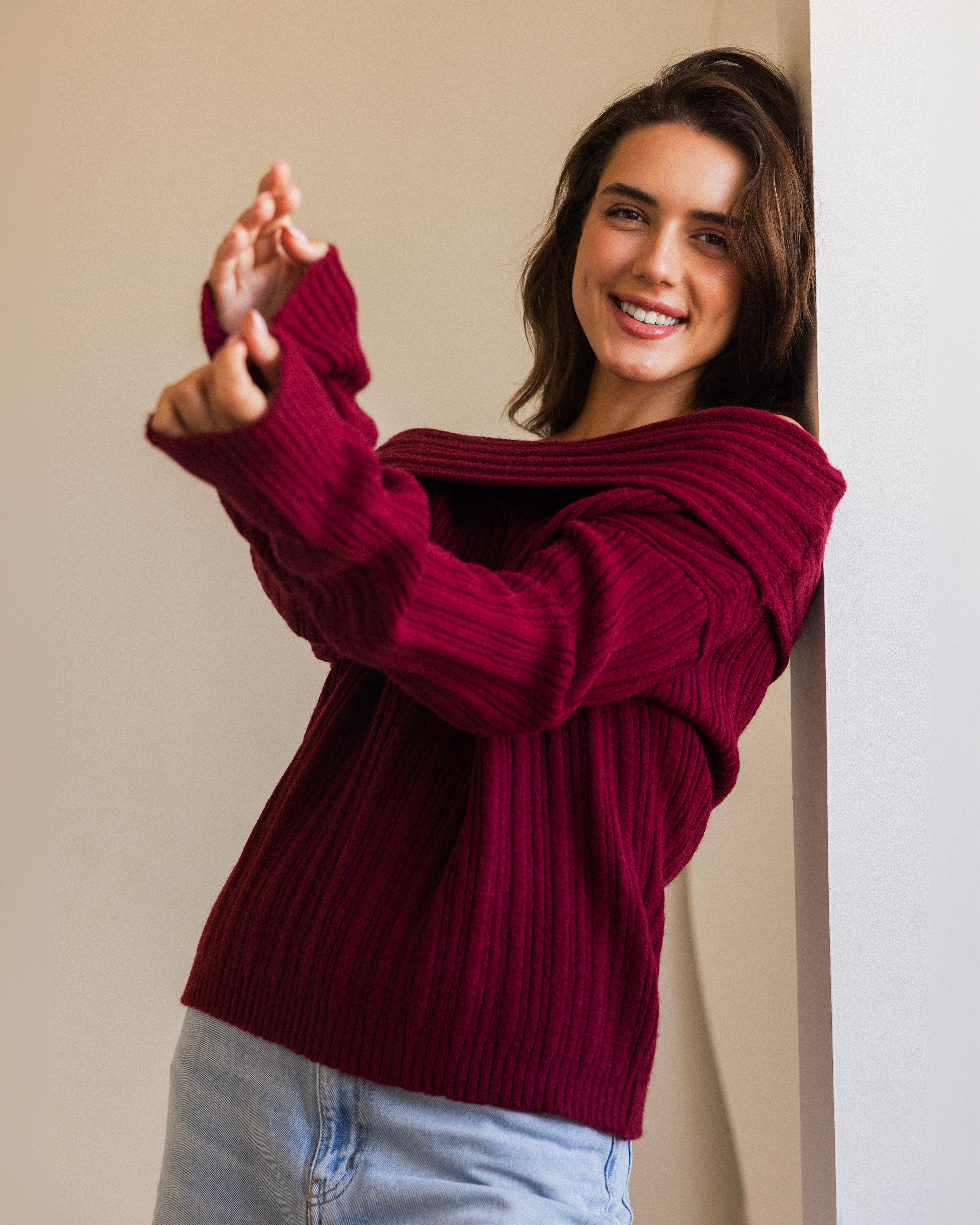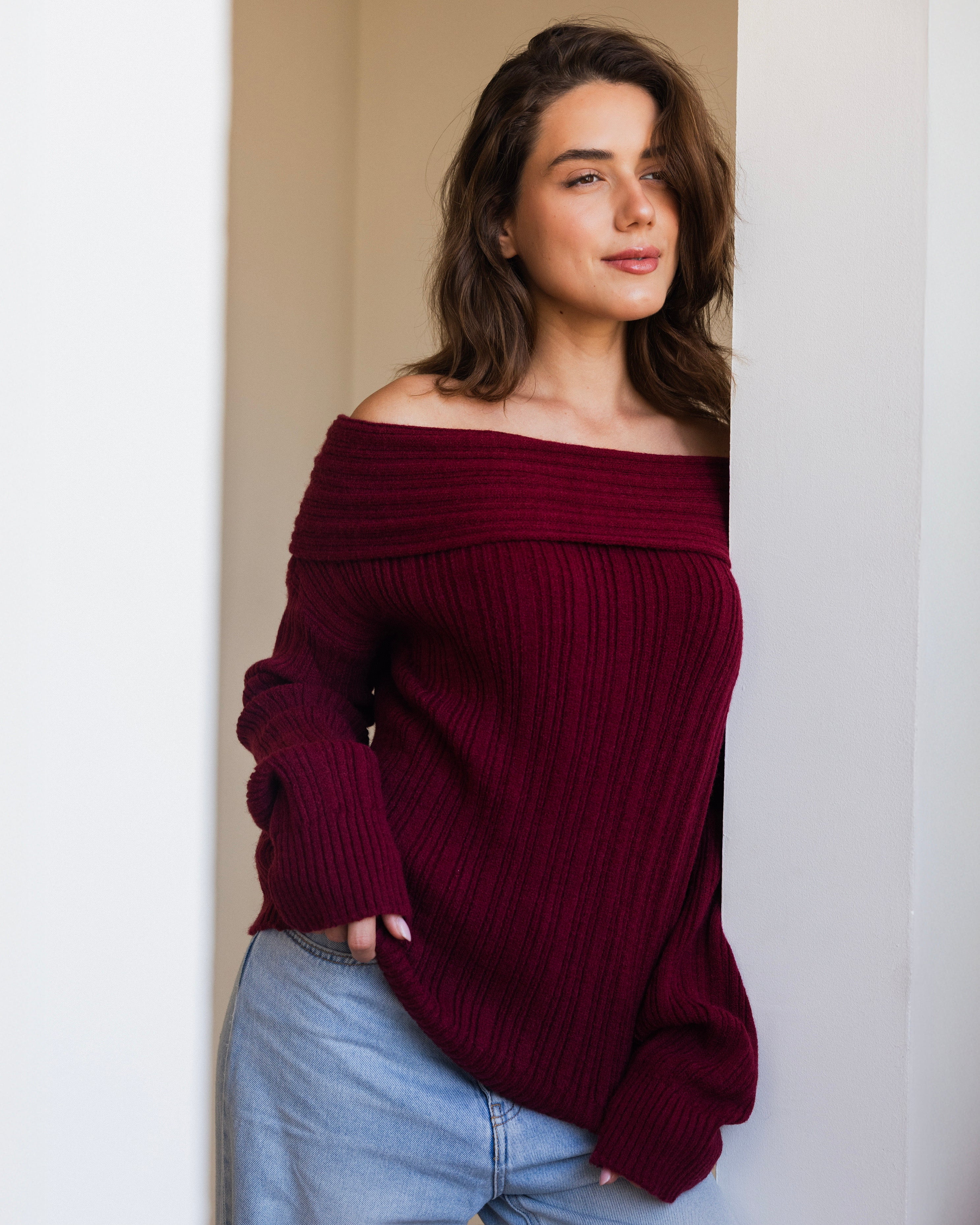 Off-Shoulder Knit Sweater- Burgundy